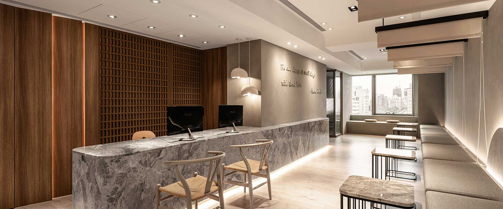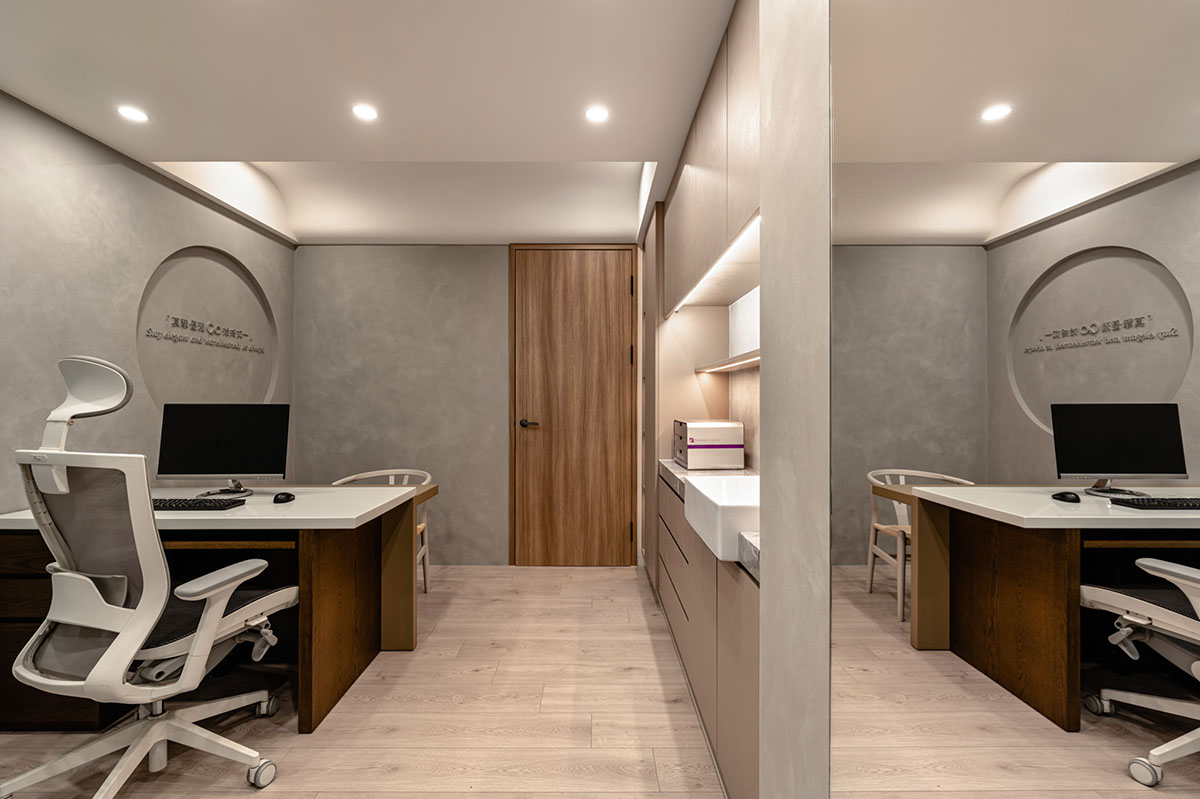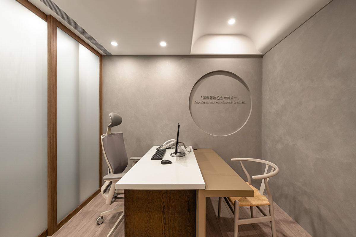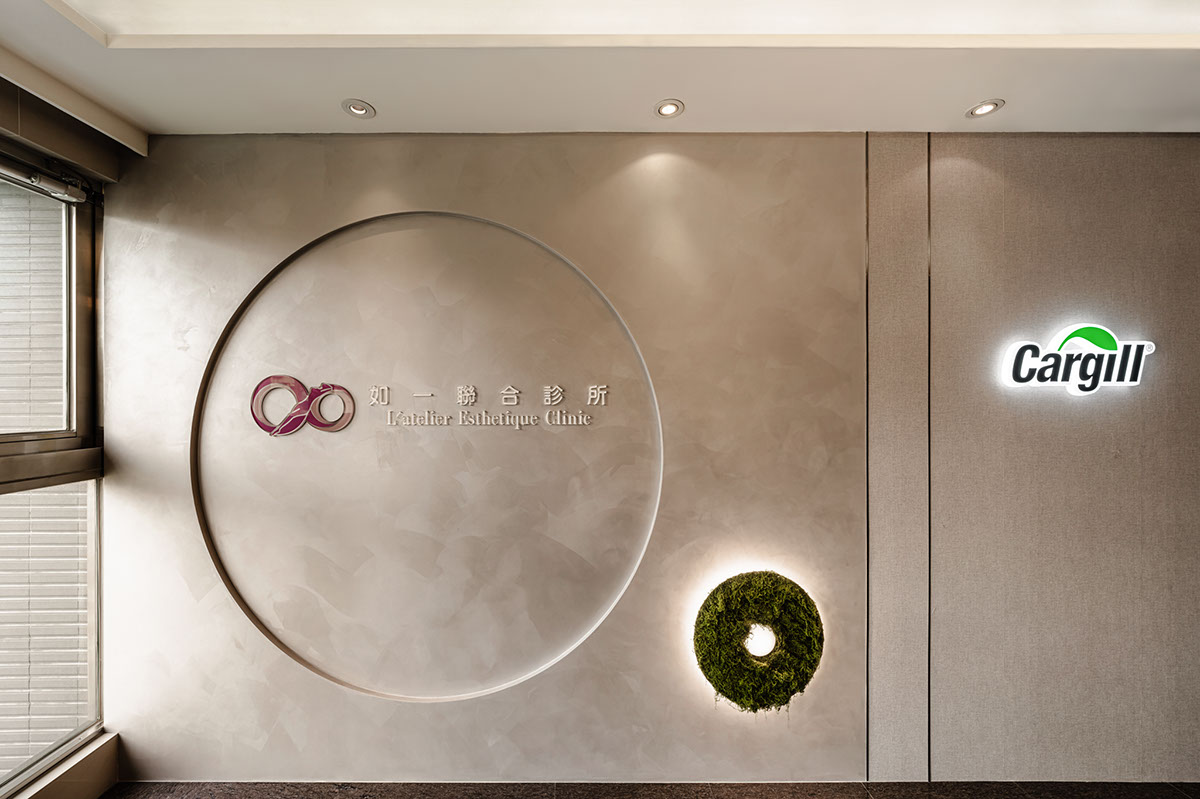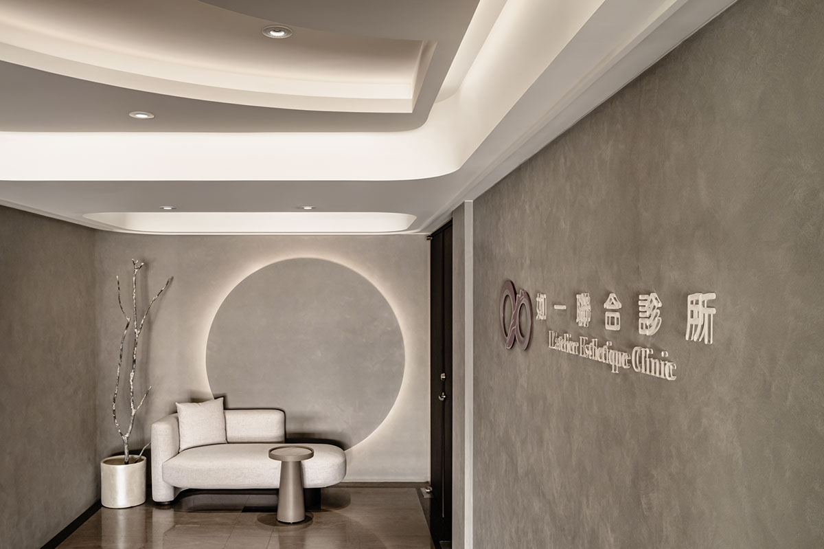 呼應企業商標的圓潤造型、以及提供女性客群為主的醫美服務,設計師於多處立面、天壁匯入流線、圓弧設計,象徵女子優雅的身體曲線,並將業者「以人工美呈現自然美」的理念作為設計核心,藉由同是人為的室內裝修展現天成美感,全案鋪敘木質、大理石與仿混凝土質感的特殊塗料,輔以入口旁植栽區、走廊末端引入的天光,挹來置身戶外般的純淨自然氣息,間或點綴布藝、鍍鈦鐵件等人造材質,堆疊細處層次感同時,完美呈遞融匯品牌概念的醫療場所。
