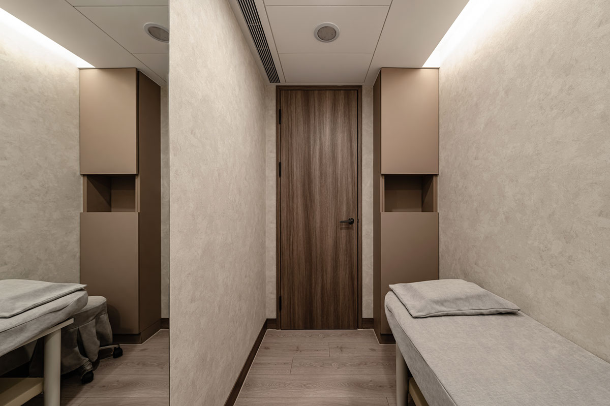 The clinic provides aesthetic medicine services to female target clients, echoing the brand image by the logo in a round shape. The designer adopted curves and rounded shapes to signify elegant women’s body shapes. Besides, they developed the design based on the clinic’s brand concept- “artificial beauty complements natural beauty.” Similarly, the interior decorations contribute to shaping a natural character. The project incorporates natural materials such as timber, marble, and concrete textures made from decorative paint coordinated with artificial fabric and metallic elements, adjoined green plants, and natural light. Exquisitely, comprehensive layering approaches reveal a perfect branding medical practice.
