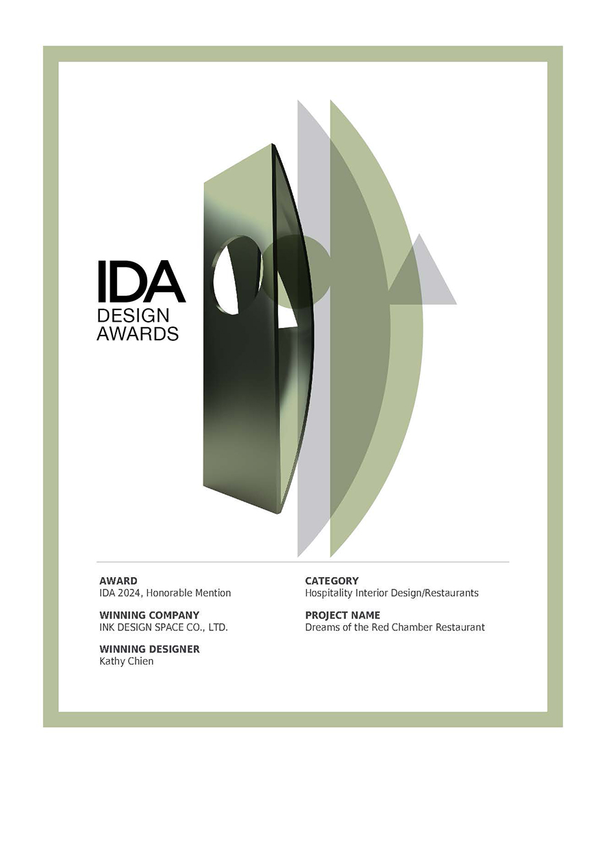 簡兆芝室內設計 主持設計師 簡兆芝 匠心活用飯店各層不同的風情轉換,全案鋪展深木復古感,令來客由淺色調一樓大廳乘坐電梯入店時,透過截然不同的沉穩雅韻予以人們深刻迎賓印象,餐廳內部更調和中西方元素,造就《弈夢紅樓餐廳》東西合璧的唯美用餐氛圍,勇奪2024 International Design Awards「Honorable Mention」獎項!
