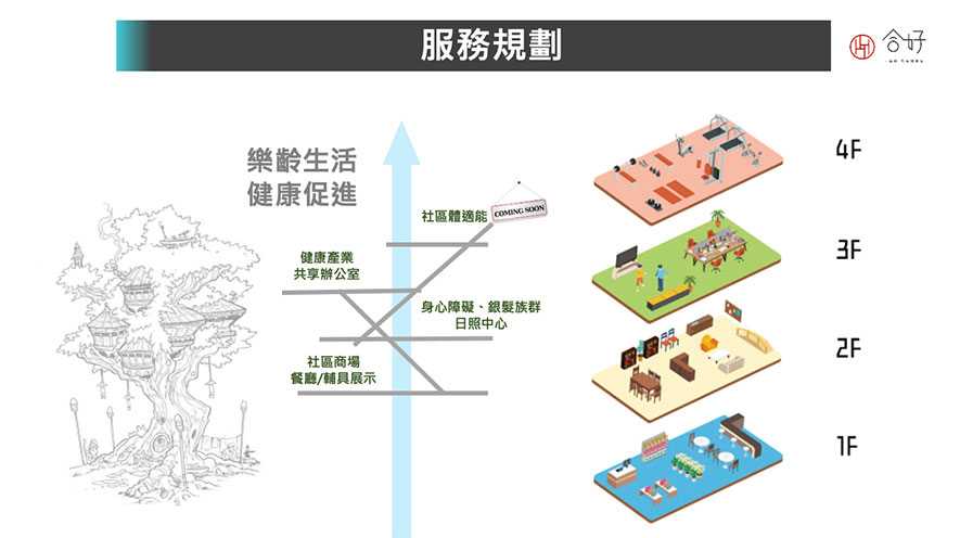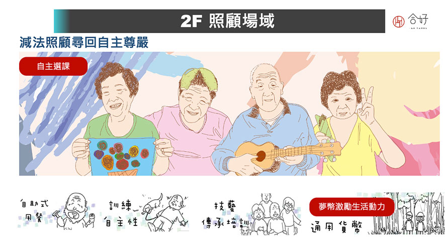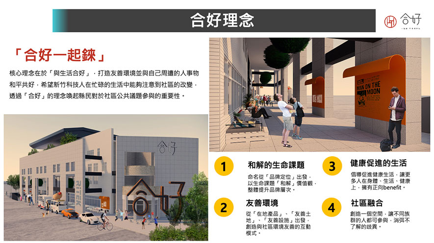 位於新竹縣的 合好一起錸 大樓,原為身心障礙福利服務中心,提供身障族群照顧及兒童早療等服務,於2018年由 財團法人錸德文教基金會 承接後,以「共同齊心」、「與生活合好」的概念重新配置建築設施,融匯社區商場、日照中心、共享辦公室、健身房於一身,藉分層及空間趣味性幫助各世代彼此理解、打破隔閡,並期盼透過這樣的設計規劃,在吸引周遭居民之餘,令青壯年攜手自家長輩、孩童共同參與大樓內的多樣活動,進一步促進青銀共融,成就一處不論長幼、族群皆可參與使用的友善場所,也讓未來的室內設計師們在劃設場域時可作為參考範例。