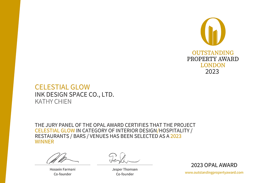 OUTSTANDING PROPERTY AWARD LONDON,OPAL(英國倫敦傑出地產大獎)由全球知名企業集團Farmani Group組織,並以招攬全球最佳建築師、室內設計師與房地產開發商為目標,在創造異業菁英聯合平台的同時,找尋各地最富創造力、革新感、社會影響力與永續性的設計方案。參與者有機會替自己最新穎的企劃,博得國際能見度,並且和產業的先驅及專業人士進行交流。